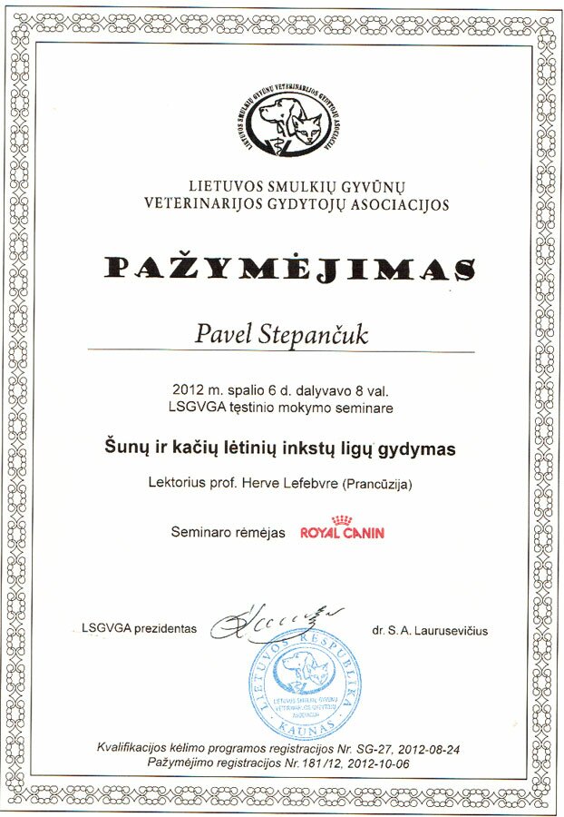 Veterinarijos gydytojas Pavel Stepančuk spalio 6 d. dalyvavo šunų ir kačių lėtinių inkstų ligų seminare. Seminarą skaitė profesorius iš Prancūzyjos Herve Lefebvre. Buvo įsisavinti naujausi diagnozavimo ir gydymo metodai inkstų ligų srityje .